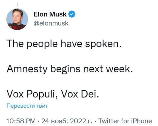 «Народ сказал своё слово. Амнистия начнётся на следующей неделе», — написал он, имея в виду устроенное им в среду голосование. В продлившемся сутки опросе приняли участие более 3 млн пользователей, 72,4% из них высказались за восстановление аккаунтов «при условии, что они не связаны с нарушением закона или рассылкой спама». Vox populi, vox Dei, — подытожил Маск, что в переводе с латыни значит «Глас народа — глас Божий».