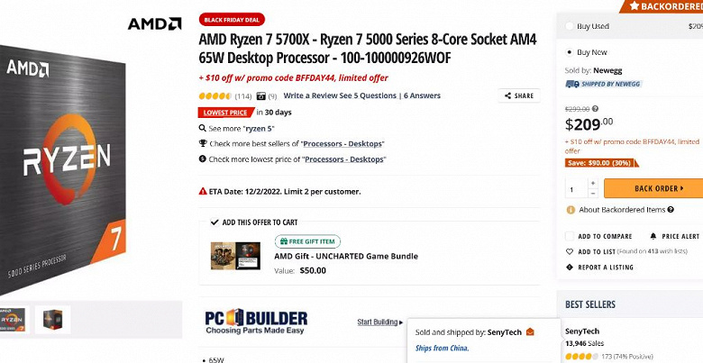 Черная пятница в США принесла существенные скидки на процессоры AMD Ryzen 5000. Так, 8-ядерная модель Ryzen 7 5700X с TDP 65 Вт стала доступнее на $100 – на площадке Newegg этот CPU можно купить всего лишь за $200.
