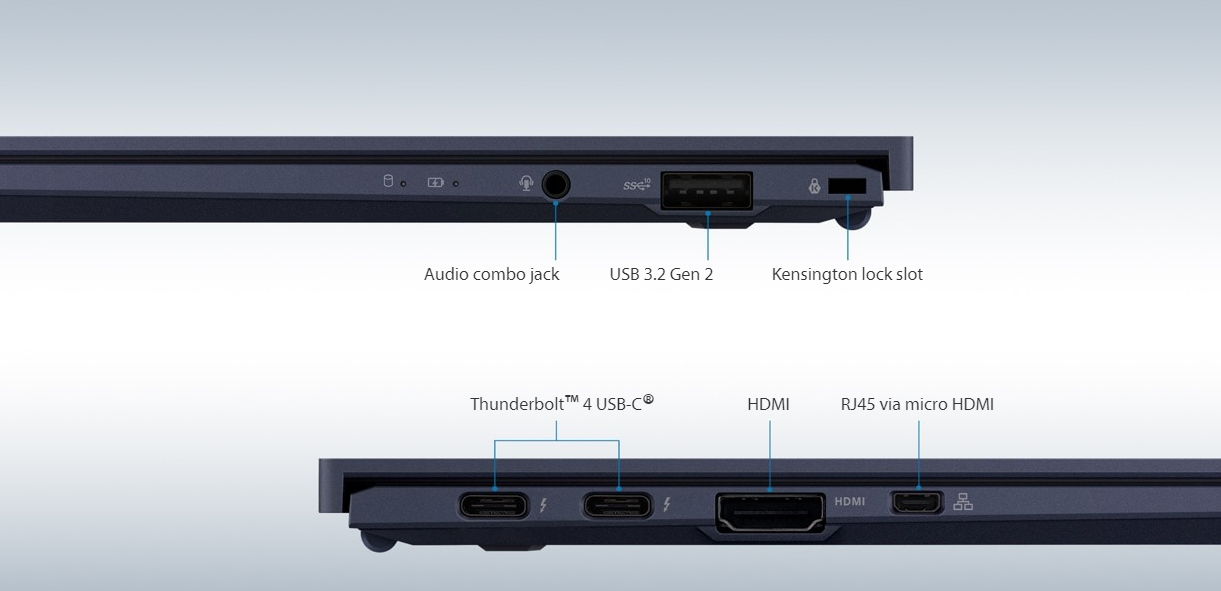 Экран диагональю 14 дюймов характеризуется разрешением Full HD. Он занимает 94% площади крышки. Также ноутбук предлагает 16 ГБ ОЗУ и SSD объёмом 1 ТБ. Набор портов включает USB 3.2, пару Thunderbolt 4, HDMI 2.0b и micro-HDMI, посредством которого реализован сетевой разъём. Важно отметить отсутствие слотов для карт памяти.