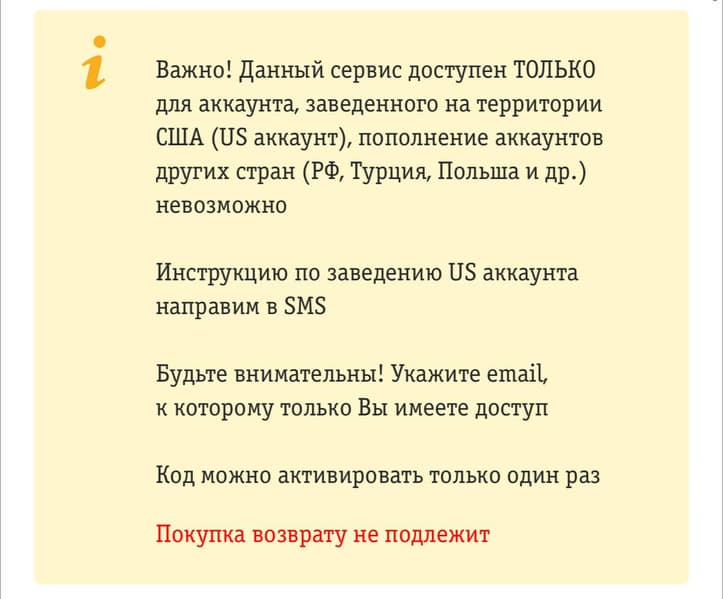 После выбора нужной услуги абонент указывает адрес электронной почты, получает на него код активации, а сумма списывается со счёта мобильного телефона. Стоит отметить, что проблему российского аккаунта «Билайн» не решает, чтобы код активации сработал, потребуется учётная запись, зарегистрированная не в России или ряде других стран, а в США.
