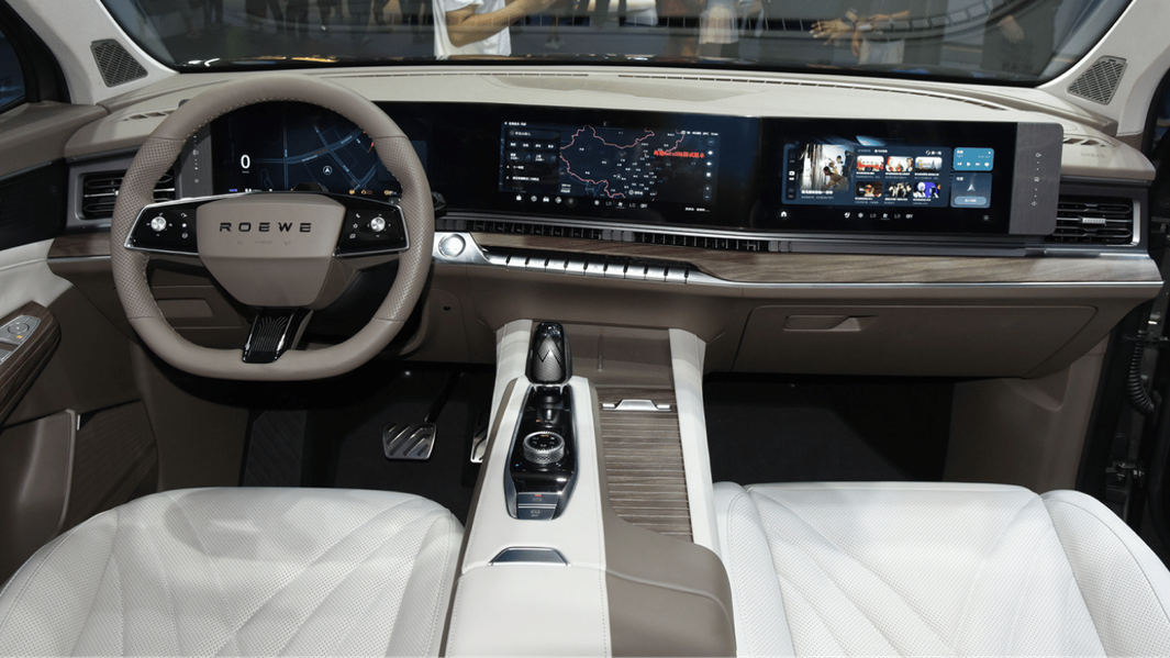 Интерьер Roewe RX9 выглядит впечатляюще, в основном из-за большого блока экранов на центральной консоли. Он состоит из цифровой приборной панели, центрального экрана для водителя и дисплея для переднего пассажира. Точная диагональ каждого экрана неизвестна. Но разработчики подтвердили, что общая диагональ этого тройного экрана достигает 47 дюймов.