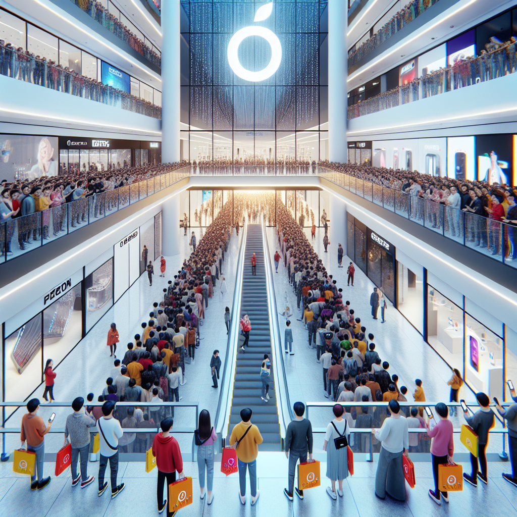 Новый магазин отличается новейшим дизайном и привлёк огромное количество людей. Изображения и видеоролики, размещённые в Twitter, показывают длинную очередь, протянувшуюся по всему верхнему уровню торгового центра.