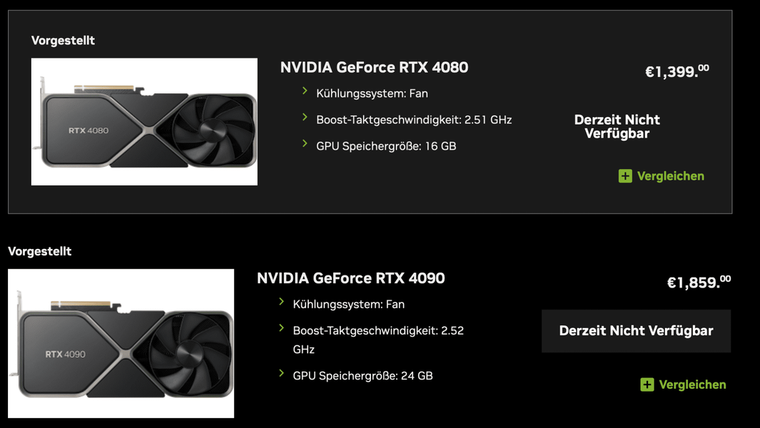Это рекомендованные цены. В реальности за RTX 4090 в Европе сейчас просят минимум 2150 евро, а RTX 4080 обойдётся не менее чем в 1387 евро. То есть младшая новинка уже сейчас продаётся дешевле новой рекомендованной цены, тогда как старшая карта всё ещё не опустилась даже до изначальной рекомендованной цены.