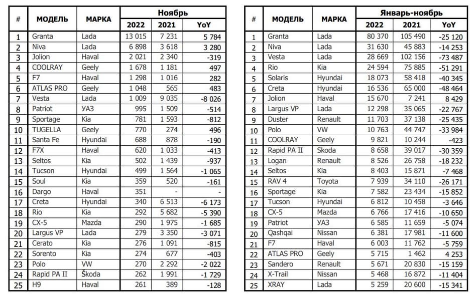 В топ-10 автопроизводителей по итогам ноября вошли: АвтоВАЗ, Haval, ГАЗ, Geely, УАЗ, Kia, Hyundai, Renault, Skoda и Changan. Причём в случае ГАЗа и УАЗа в статистике учитываются коммерческие автомобили. Прежние лидеры — за пределами десятки. Так, в России в ноябре было продано всего 387 Volkswagen (минус 92% в годовом выражении), поэтому бренд только на 11-й позиции. Но это ещё неплохо. Продажи Toyota в России упали на 99%: за ноябрь 2022 года реализовано 103 авто против 7606 авто год назад. В итоге Toyota опустилась на 18-е место.