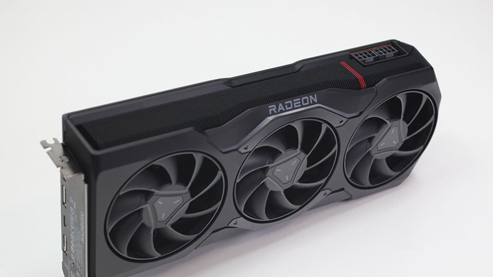 Из менее значимого можно отметить два разъёма питания (8 + 8), датчик температуры воздуха сразу за вентилятором и те самые три красные полоски на радиаторе. Оказывается, они символизируют третье поколение карт на архитектуре RDNA.
