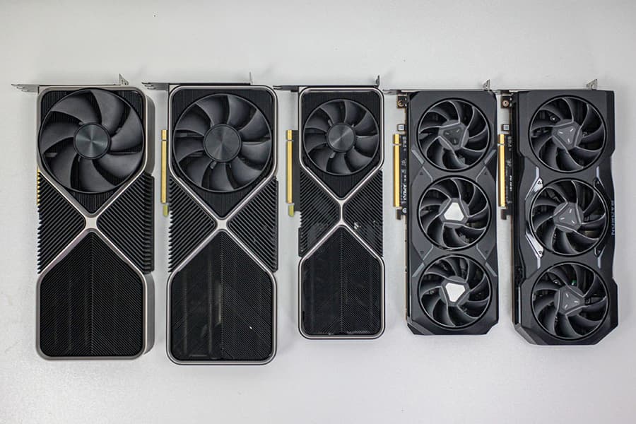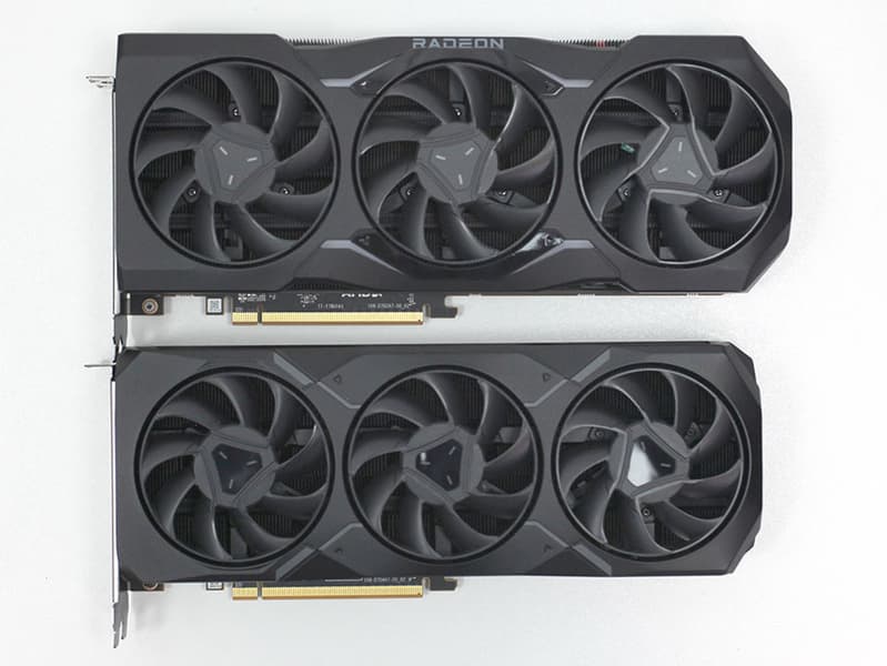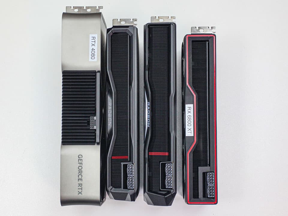 Несмотря на то, что внешне RX 7900 XTX и RX 7900 XT максимально похожи, они всё же не идентичны. Старшая модель имеет длину 287 мм и весит 1,8 кг, а младшая при массе 1,5 кг характеризуется длиной 267 мм. По меркам современных флагманов Nvidia это весьма компактные решения. Кроме того, они занимают лишь 2,5 слота расширения вместо трёх-четырёх у новинок GeForce RTX 40. Собственно, на общем фото хорошо видно, насколько новинки AMD меньше.