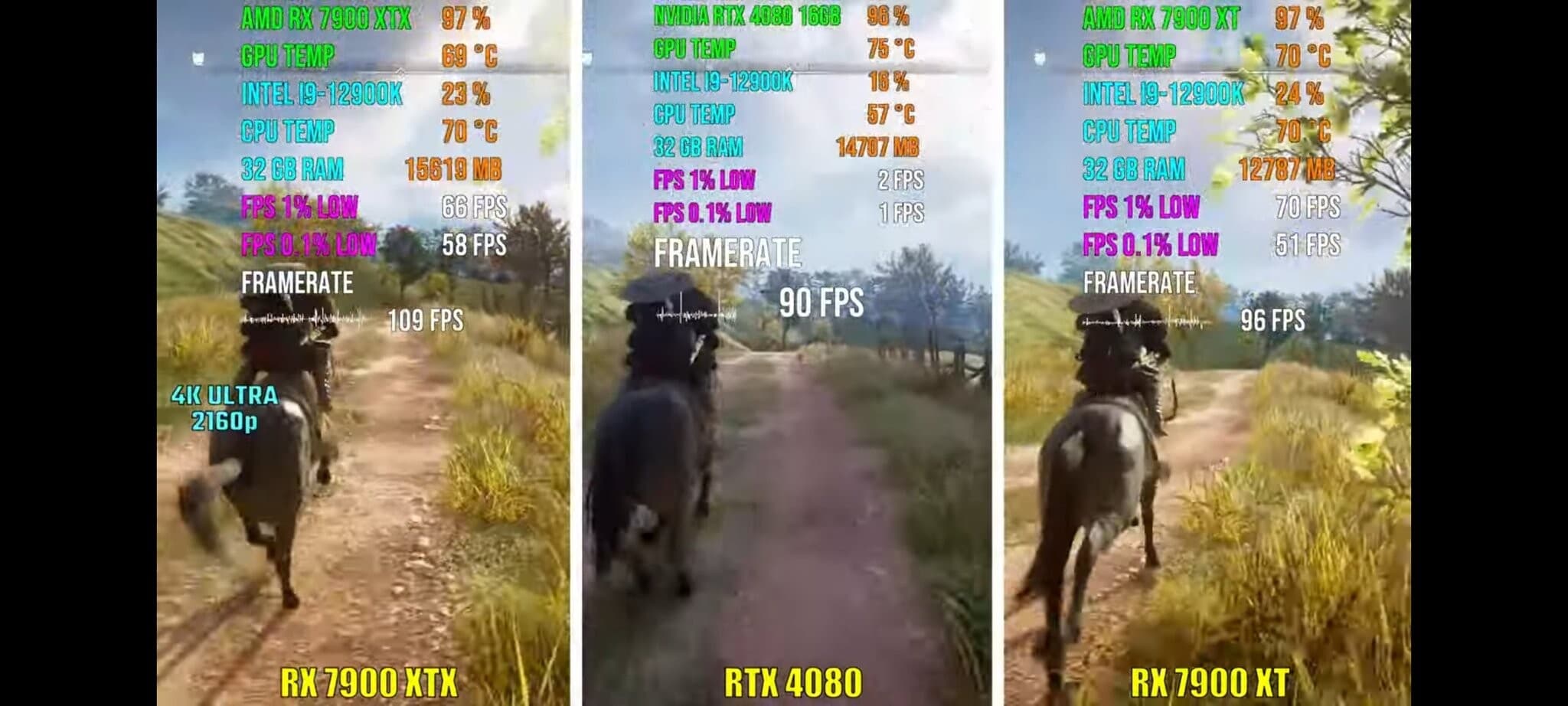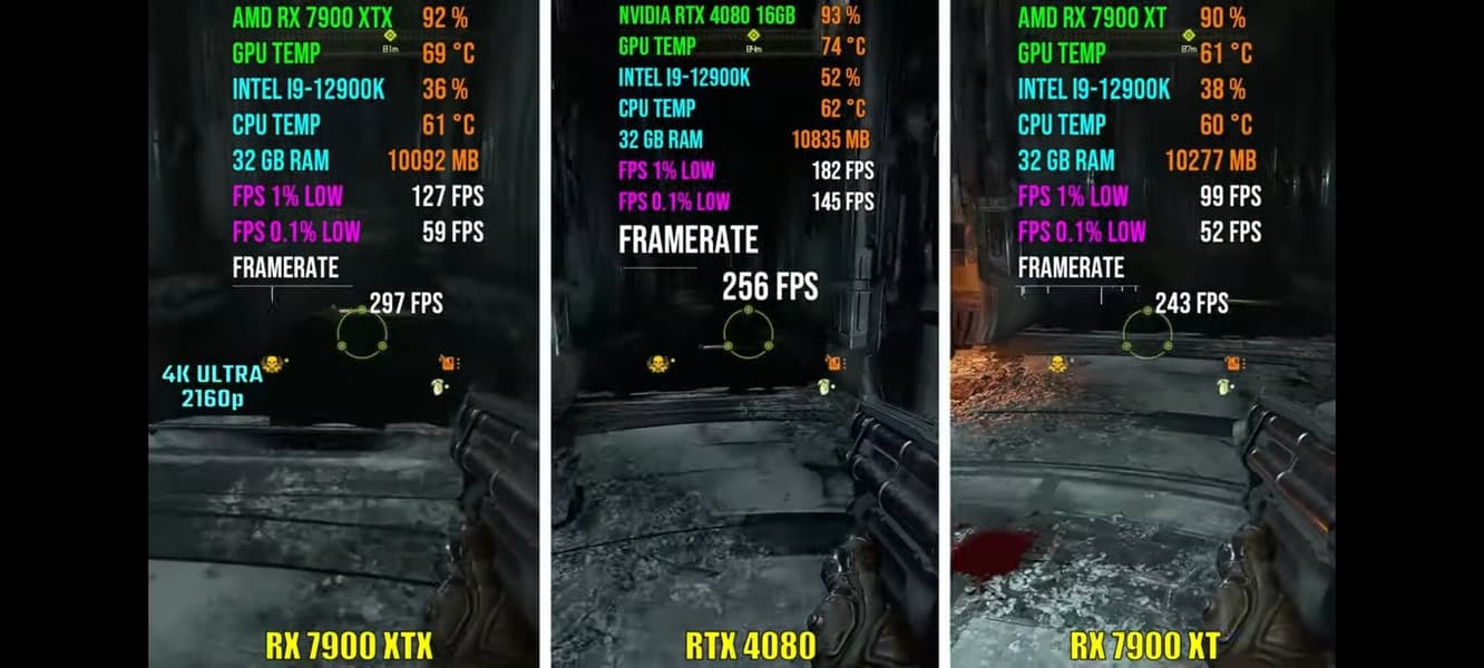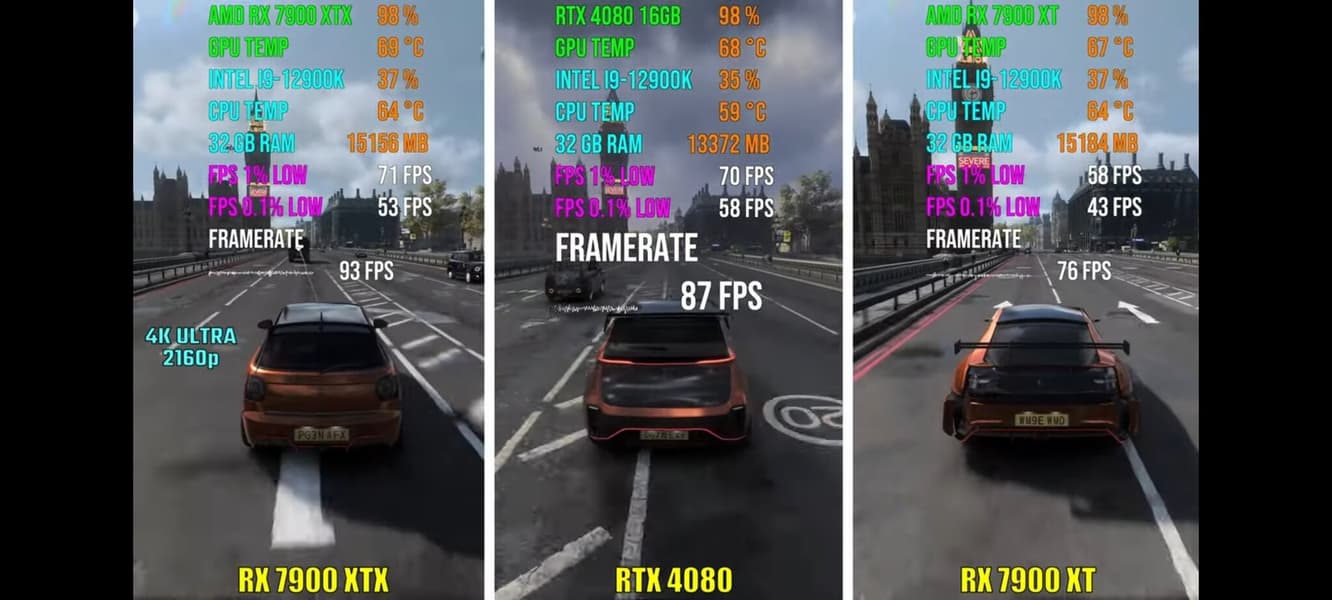 Что касается RX 7900 XTX, она была ощутимо быстрее везде, хотя в паре игр разрыв был невелик.