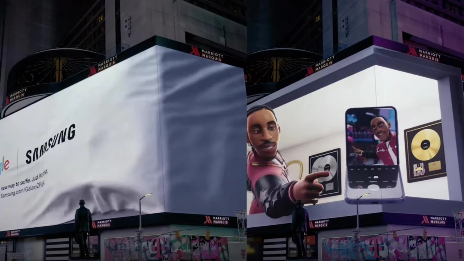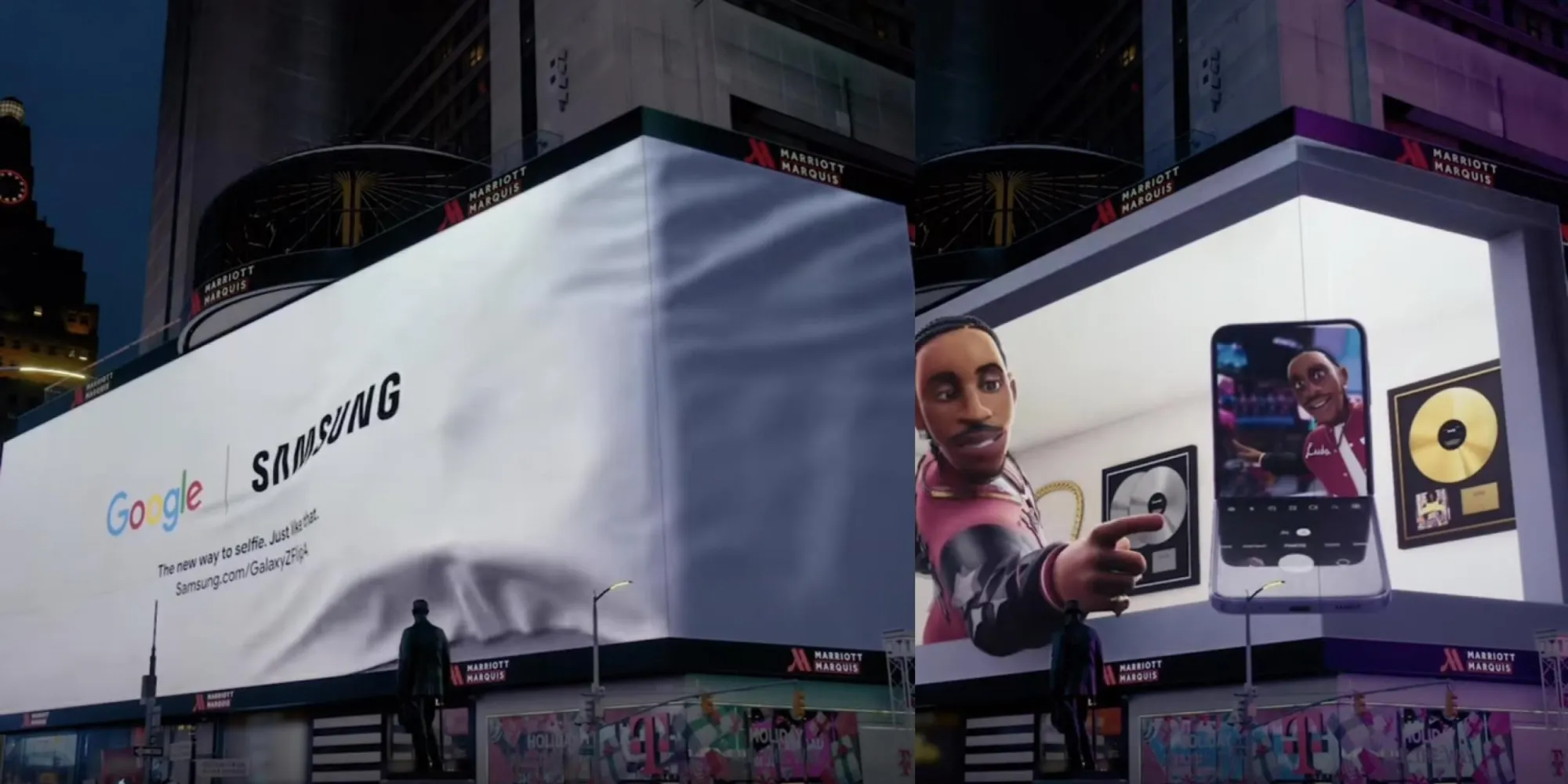 В данный момент Google и Samsung проводят совместную рекламную кампанию, запустив ролик на большом экране на Таймс-сквер, в которой показывают раскладушку Samsung Galaxy Z Flip 4 и его возможности.