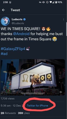 Пользователи Сети сразу же заметили, что американский рэпер Лудакрис, рекламируя смартфон Samsung, оставил соответствующий пост в Twitter со смартфона iPhone.