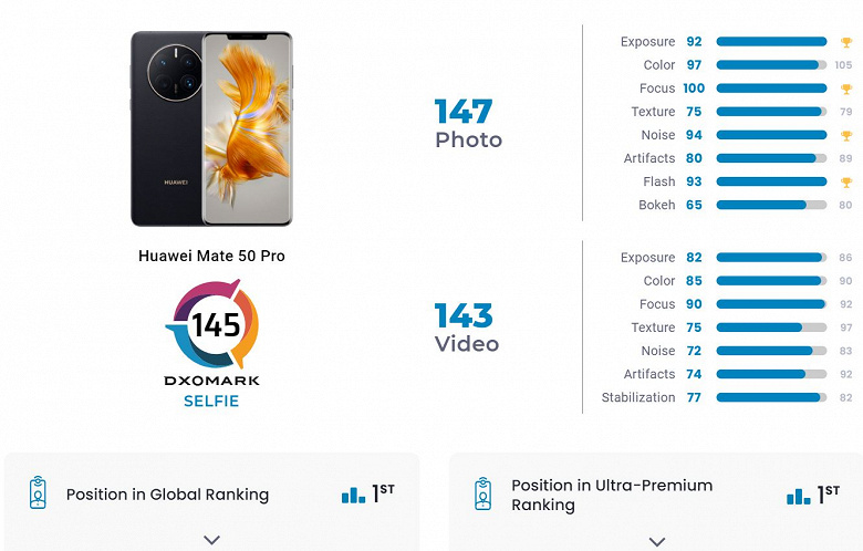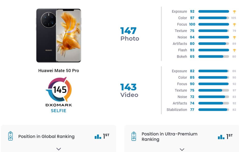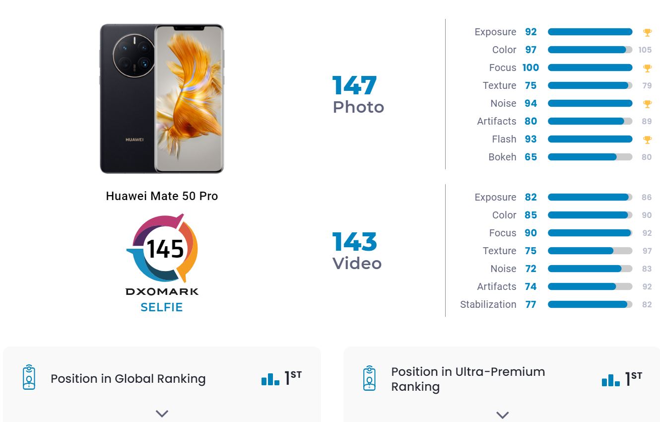 Huawei Mate 50 Pro уже полтора месяца возглавляет мировой рейтинг камерофонов DxOMark, составленный на основе тестов основной камеры. Сейчас специалисты протестировали фронтальную камеру телефона и пришли к выводу, что она тоже лучшая на текущий момент.