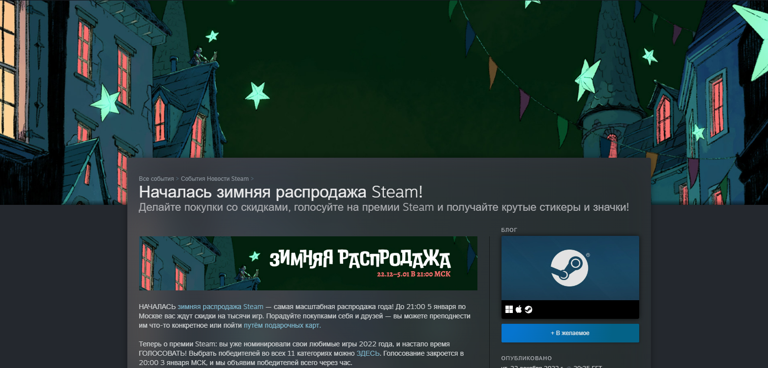 Качалась зимняя распродажа Steam — самая масштабная распродажа года! До 21:00 5 января по Москве вас ждут скидки на тысячи игр. Порадуйте покупками себя и друзей — вы можете преподнести им что-то конкретное или пойти путём подарочных карт. Теперь о премии Steam: вы уже номинировали свои любимые игры 2022 года, и настало время голосовать! Выбрать победителей во всех 11 категориях можно здесь. Голосование закроется в 20:00 3 января МСК, и мы объявим победителей через час после этого.