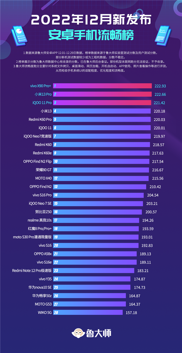 С точки зрения плавности работы лидером являются Vivo X90 Pro+, Xiaomi 13 Pro и iQOO 11 Pro. Две модели в тройке лидеров работают под управлением оболочки OriginOS, а Xiaomi 13 Pro получил новую оболочку MIUI 14. Xiaomi 13 и Redmi K60 попали в пятёрку лидеров.
