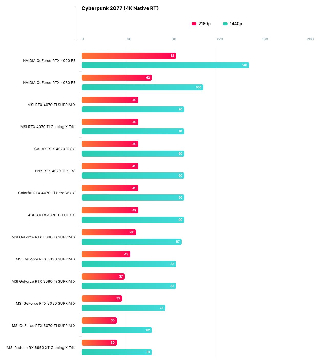Для геймеров, рассматривающих разрешением 1440p в качестве основного, GeForce RTX 4070 Ti является сейчас едва ли не лучшим выбором. К тому же она поддерживает DLSS 3, а производительность с трассировкой лучей в реальном времени выше, чем у GeForce RTX 3090 Ti. И все это достигается при потреблении около 200-250 Вт против 400-500 Вт в случае GeForce RTX 3090 Ti. Свою лепту в сниженное потребление вносит как новая архитектура, так и новый техпроцесс TSMC 4N.