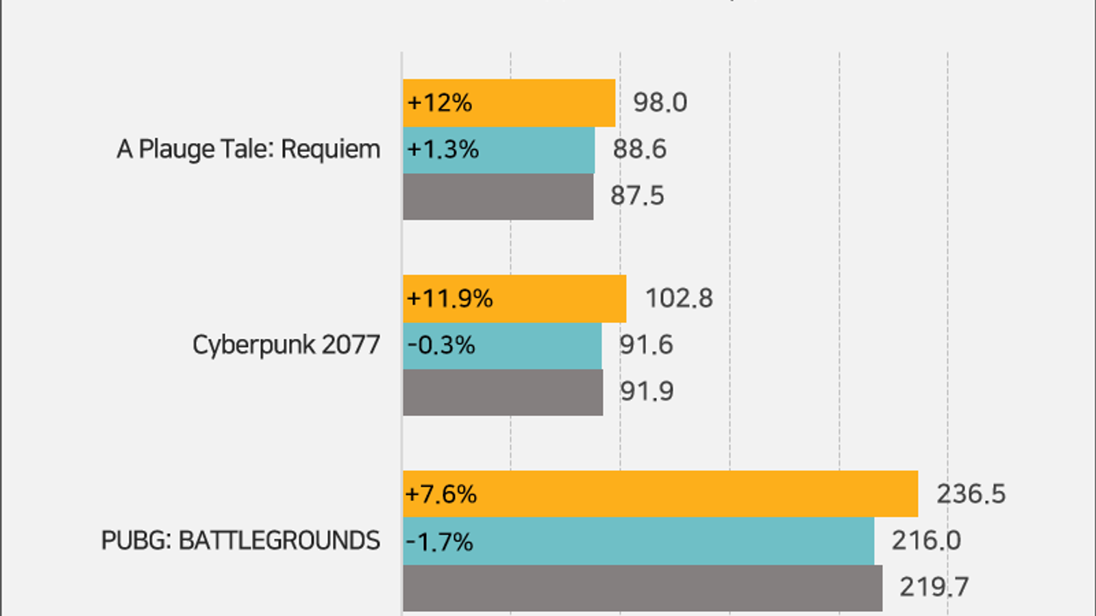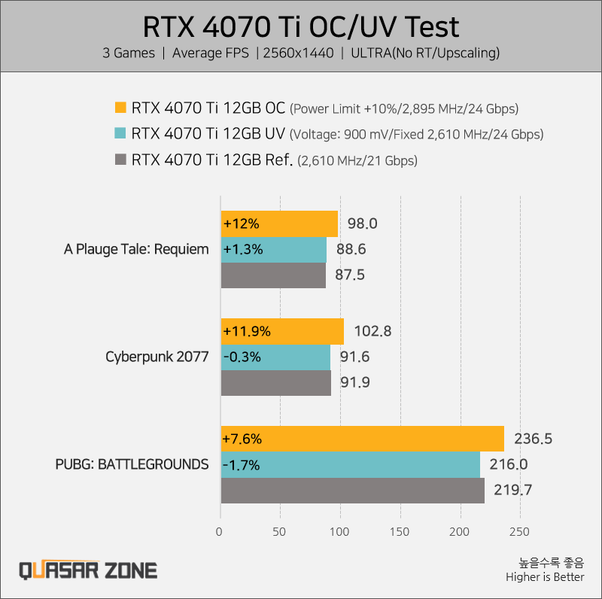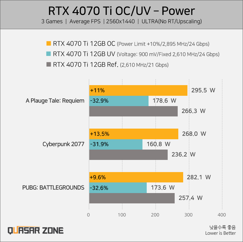 Как можно видеть, при снижении напряжения на GPU до 900 мВ производительность в играх условно вообще не меняется, при этом потребление падает на треть! В таком режиме новинка потребляет всего 160-180 Вт, а это уровень GeForce RTX 3060!