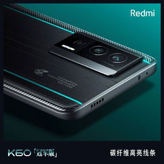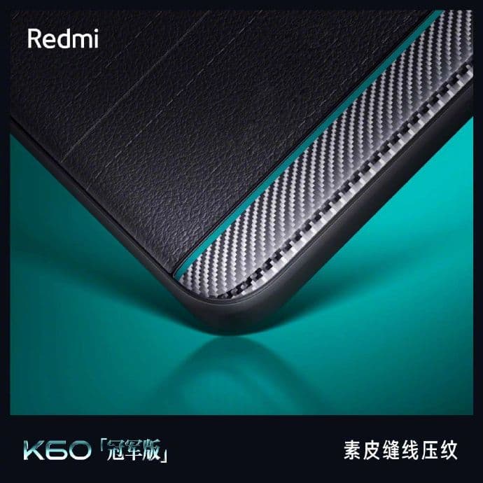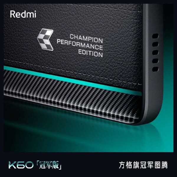 По характеристикам Redmi K60 Champion Edition копирует модель Redmi K60 Pro, но имеет другой дизайн. На задней панели используется пластик с текстурой кожи, а также пластик с имитацией карбона. Бирюзовые полоски являются отсылками к гоночной команде Mercedes-AMG Petronas, с которой сотрудничает Redmi.