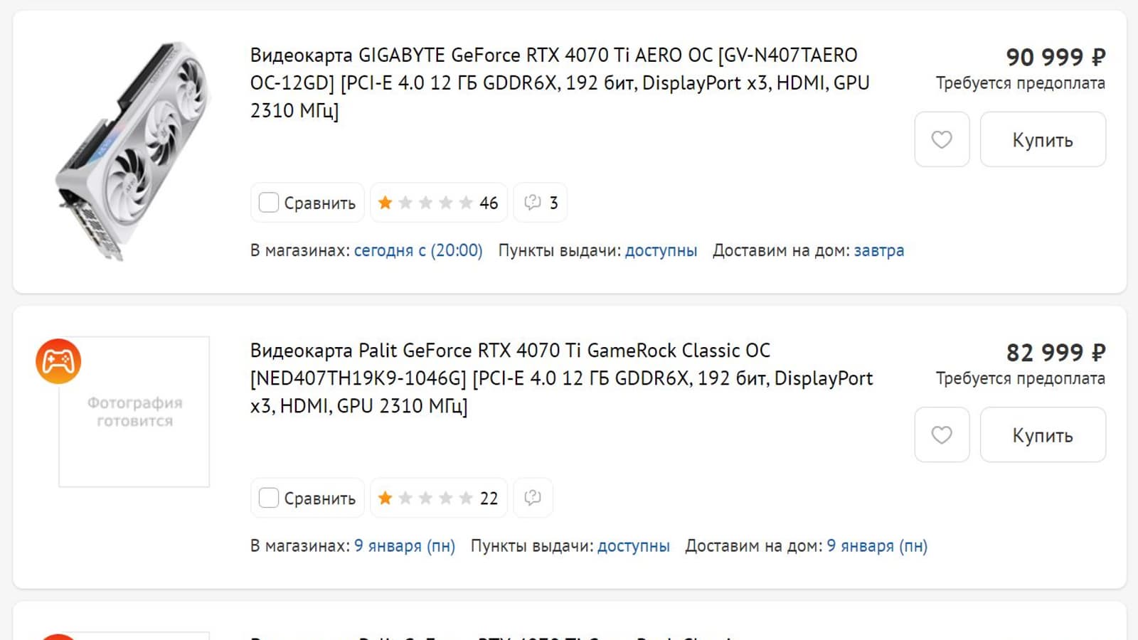 Впрочем, не радуют цены: в России видеокарта оказалась дороже, чем в США (840 долларов) или Европе (900 евро). В каталоге DNS представлены пока только три модели. Самый доступный вариант – Palit GeForce RTX 4070 Ti GameRock Classic за 81 000 рублей – уже раскуплен. Но ненамного дороже (за 83 000 рублей) предлагается Palit GeForce RTX 4070 Ti GameRock Classic OC с заводским разгоном. Ну а за белую Gigabyte GeForce RTX 4070 Ti AERO OC ретейлер просит 91 000 рублей.