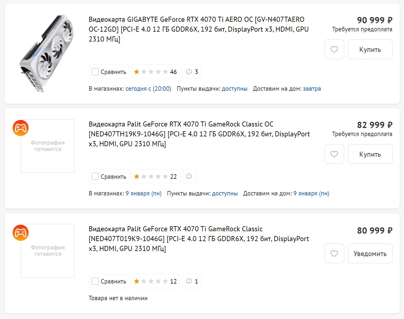 Впрочем, не радуют цены: в России видеокарта оказалась дороже, чем в США (840 долларов) или Европе (900 евро). В каталоге DNS представлены пока только три модели. Самый доступный вариант – Palit GeForce RTX 4070 Ti GameRock Classic за 81 000 рублей – уже раскуплен. Но ненамного дороже (за 83 000 рублей) предлагается Palit GeForce RTX 4070 Ti GameRock Classic OC с заводским разгоном. Ну а за белую Gigabyte GeForce RTX 4070 Ti AERO OC ретейлер просит 91 000 рублей.