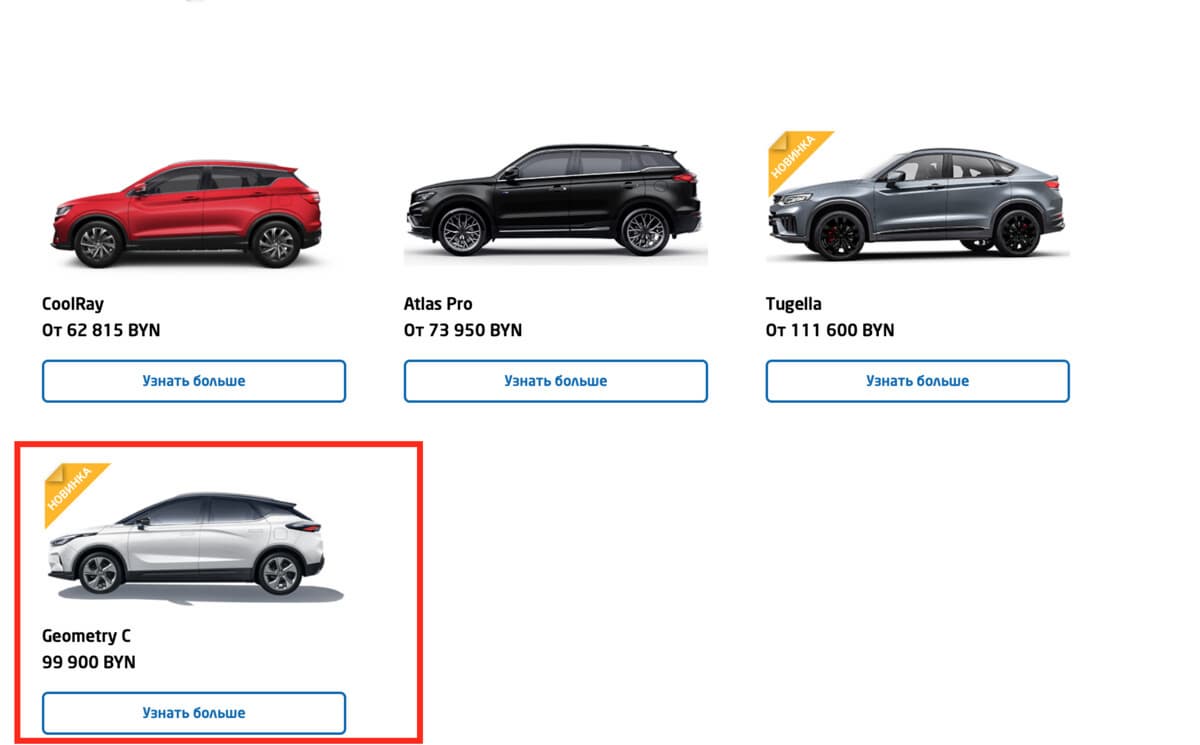 В Белоруссии возобновились официальные продажи электрического кроссовера Geely Geometry C. Как пишет местный автомобильный портал av.by, в страну завезли примерно 40 авто, которые распределили по дилерам марки. Также Geometry C теперь представлен в каталоге на фирменном сайте Geely, чего ранее не было. Как сообщается, в текущем году в стране планируют продать 400-500 Geometry C.