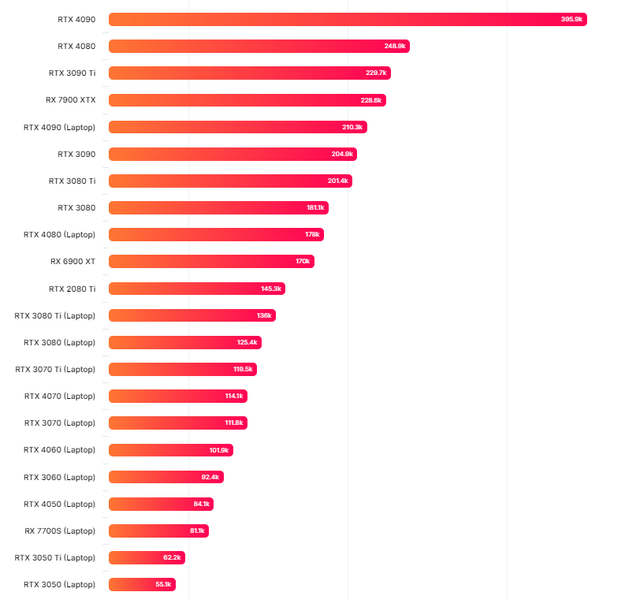 Если сравнивать это с другими картами, то мобильная RTX 4090 немного опережает настольную RTX 3090, и это очень впечатляет. Мобильная RTX 4080 примерно равна настольной RTX 3080, а вот мобильная RTX 4070 почему-то совершенно не быстрее мобильной RTX 3070.
