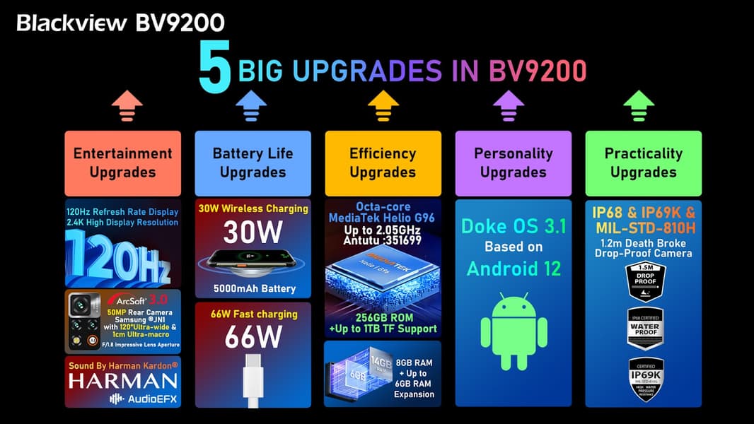 Blackview BV9200 — первое устройство, которое работает под управление Doke 3.1 на базе Android 12. Смартфон соответствует степени защиты IP69K и требованиям американского военного стандарта MIL-STD-810H.