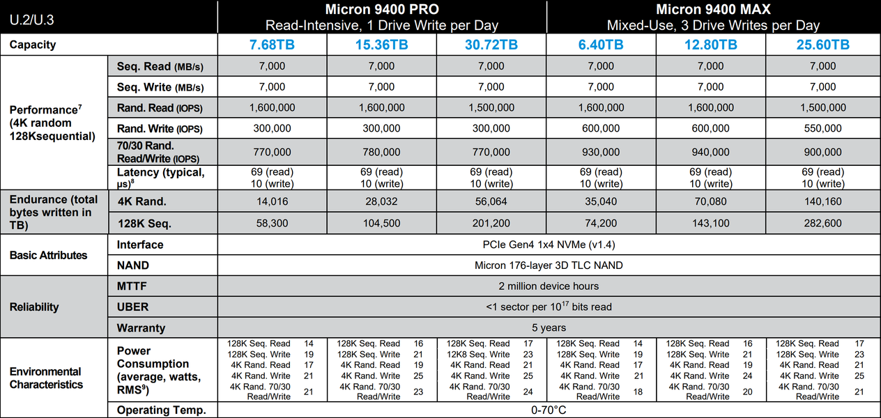 В линейке достаточно много моделей, поделённых на две других линейки: 9400 Pro и 9400 Max. Доступный объём: от 7,68 ТБ до 30,72 ТБ. Во всех случаях используется 176-слойная память 3D-NAND TLC, значение MTTF заявлено равным 2 млн часов, а гарантия составляет 5 лет.