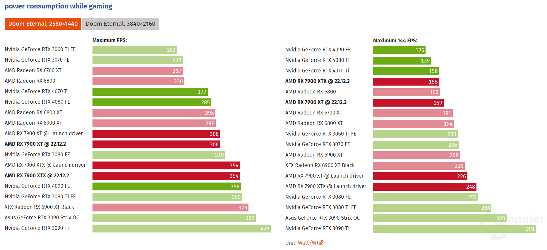 Что касается снижения потребления в играх, то оно тоже заметное, но только в тех случаях, когда кадровая частота фиксирована. Так, в Doom Eternal при разрешении 1440p и с фиксированной кадровой частотой 144 Гц RX 7900 XTX потребляет на 57% меньше, а RX 7900 XT потребляет на 34% меньше.