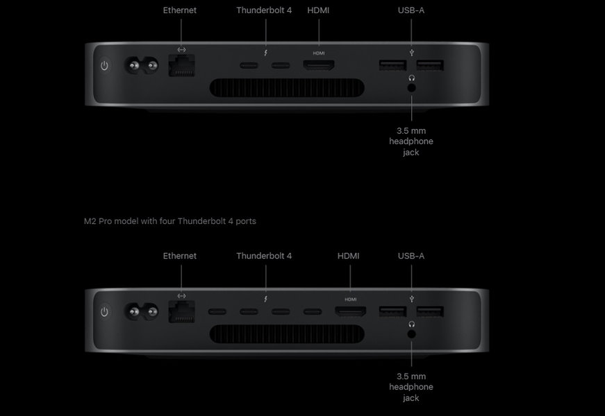 Кроме того, модификации на основе M2 и M2 Pro отличаются друг от друга набором портов. У младшей версии имеется пара Thunderbolt 4, HDMI, два USB 3.1 и RJ45, у старшей всё то же самое, но есть ещё два Thunderbolt 4. Габариты составляют 197 х 197 х 35,8 мм при массе от 1,18 кг.