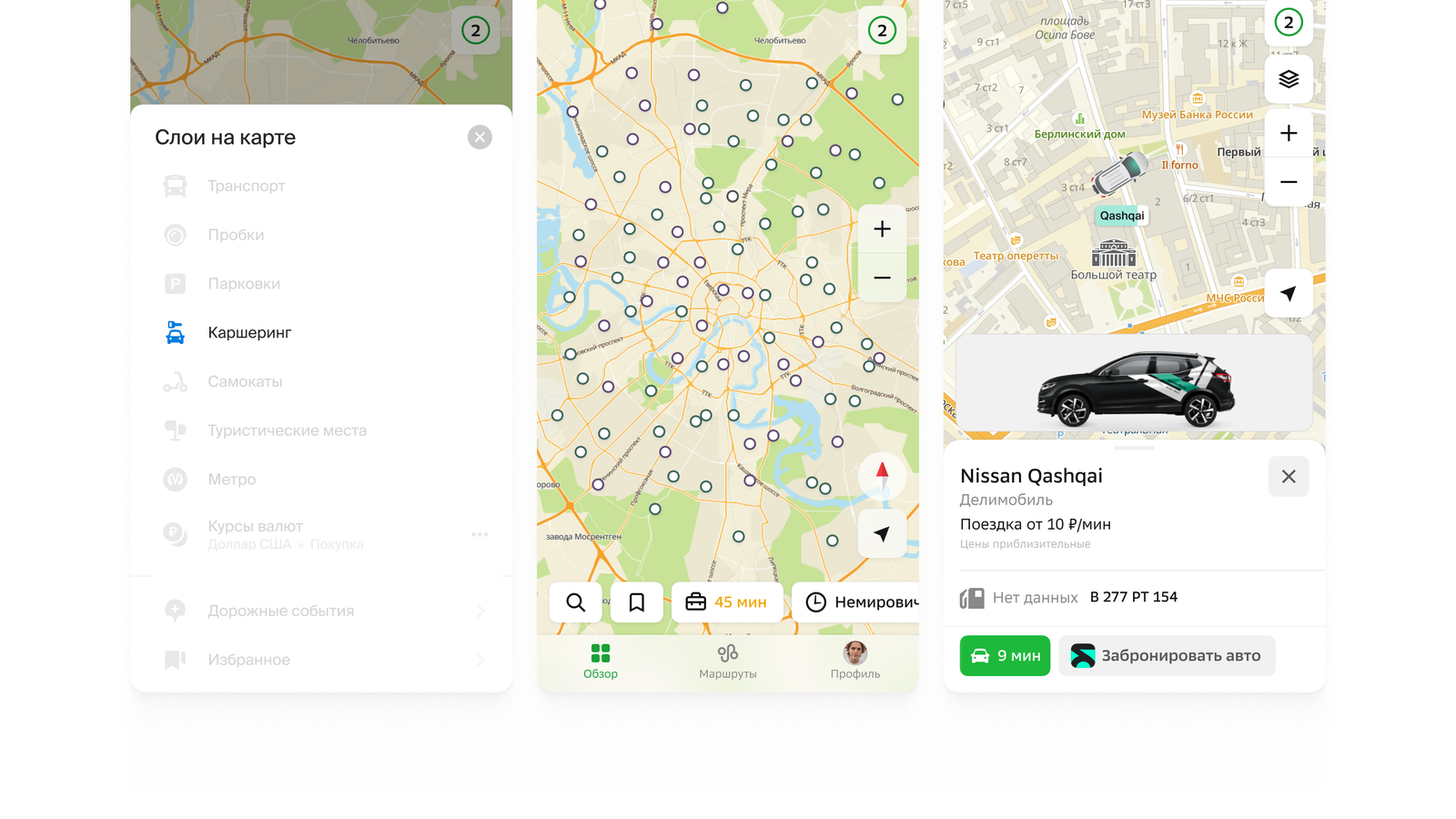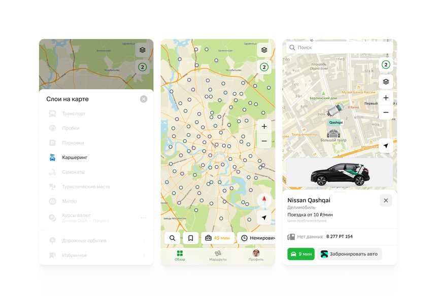 Информация о местах, где можно найти автомобили, обновляется каждую минуту, а цены сообщают соответствующие сервисы каршеринга. Это поможет пользователям лучше сориентироваться при выборе автомобиля.