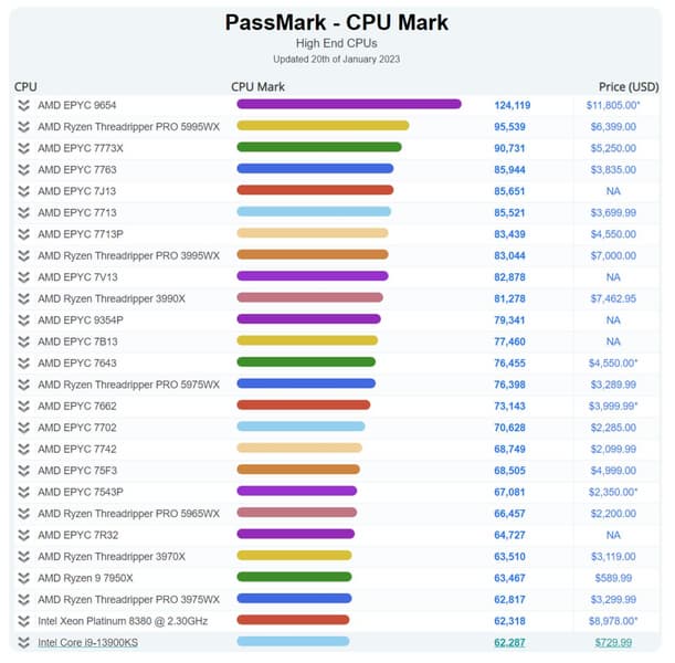 AMD представила линейку процессоров Epyc 9004 в ноябре 2022 года, серию возглавил 96-ядерный 192-поточный Epyc 9654. А сейчас он же возглавил рейтинг PassMark, причем с большим отрывом от прошлого лидера, Ryzen Threadripper PRO 5995WX.