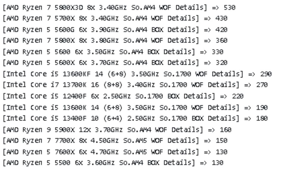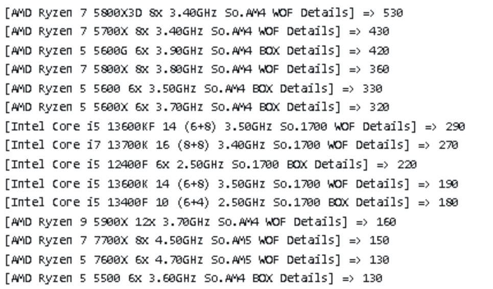 Это все были американские площадки, а что в Европе? В рейтинге процессоров немецкого магазина Mindfactory лидирует Ryzen 7 5800X3D, на второй позиции – Ryzen 7 5700X, а следом идут Ryzen 5600G, Ryzen 5900X и Ryzen 5600. Таким образом, снова два 6-ядерных представителя линейки Ryzen 5000 в топ-5.