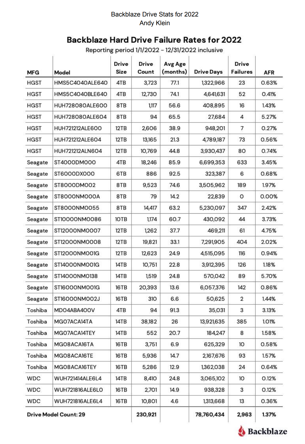 Компания Backblaze, занимающаяся хранением данных, обнародовала свой очередной отчёт, касающийся используемых ей накопителей. В данном случае речь об отчёте по итогам 2022 года.