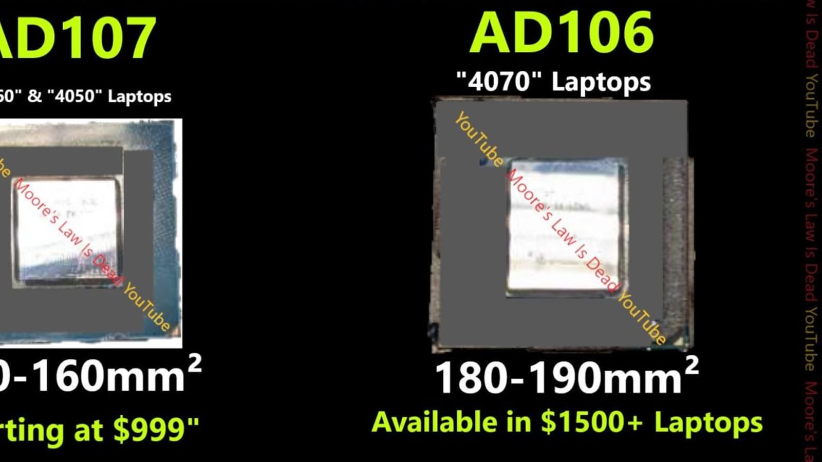 Новые GPU весьма компактны. Площадь меньшего около 150–160 мм2, а большего — 180–190 мм2. Для сравнения: AD104, на котором основана настольная RTX 4070 Ti и должна быть основана мобильная RTX 4090, характеризуется площадью почти 300 мм2.