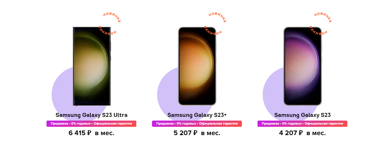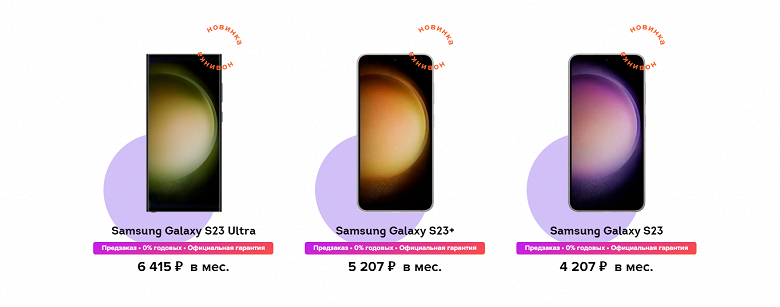 Для Samsung Galaxy S23+ стартовая цена в месяц составляет 5207 рублей при полной стоимости в 94 990 рублей. Для Samsung Galaxy S23 Ultra речь идёт о 6415 и 119 990 рублей соответственно.
