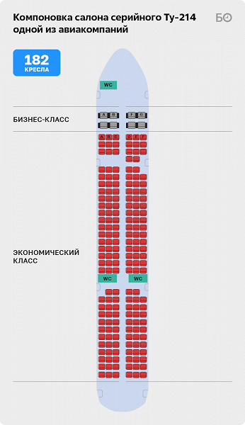 Два первых Ту-214 будут рассчитаны на перевозку 178 пассажиров (в бизнес-классе будет установлено 16 кресел), а те лайнеры, что планируются к поставке в сентябре 2025 года, смогут перевозить 182 человека.