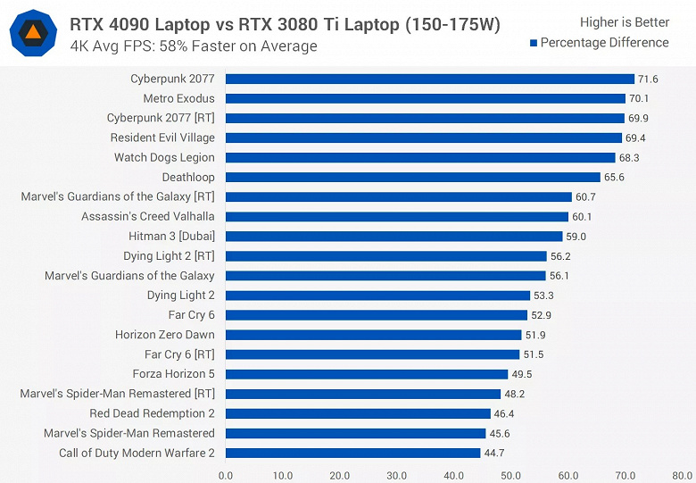 Что касается сравнения с мобильной RTX 3080 Ti, которая возглавляла линейку в прошлом поколении, тут лучше обратиться к обзору TechSpot, из которого следует, что в 4K новая карта в среднем на 58% быстрее старой! Это примерно такой же прирост, как при переходе от RTX 3090 Ti к RTX 4090.