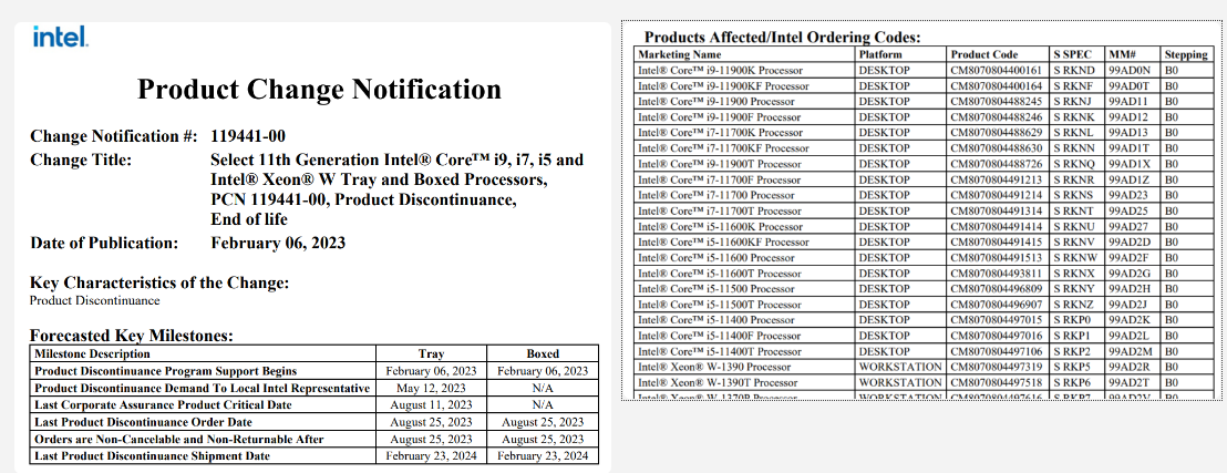 В свежем «Уведомлении об изменении продукта» указано, что 6 февраля Intel запустила процесс прекращения производства CPU Rocket Lake. Однако, как и всегда в таких случаях, это не означает, что такие процессоры резко полностью исчезнут с рынка. Последняя партия таких CPU будет отгружена лишь 23 февраля 2024 года.