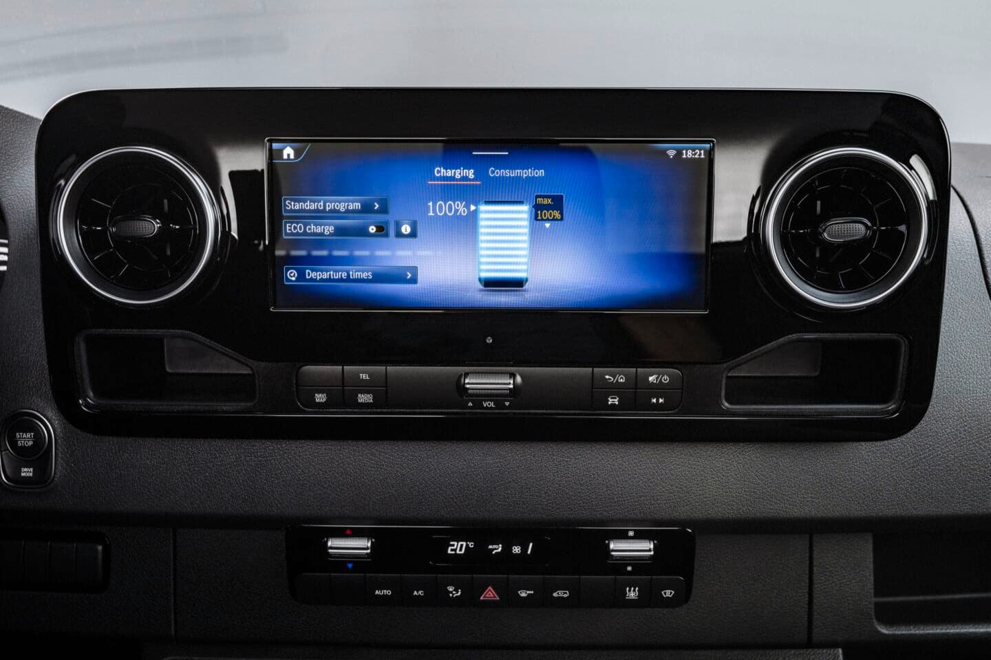 В eSprinter используется не литий-ионная, а литий-железо-фосфатная аккумуляторная батарея. Стандартная зарядка переменным током возможна при максимальной мощности 9,6 кВт, а быстрая зарядка постоянным током возможна при мощности до 115 кВт, что должно зарядить аккумуляторную батарею от 10 до 80% примерно за 42 минуты.