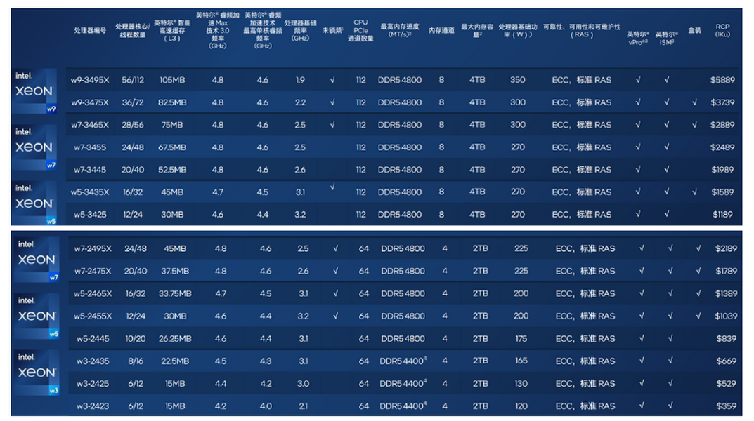 Цены на Xeon W-2400 будут варьироваться от 360 до 2200 долларов. Такие CPU также будут поддерживать до 2 ТБ ОЗУ, у них будет лишь 64 линии PCIe, но зато TDP будет ниже.