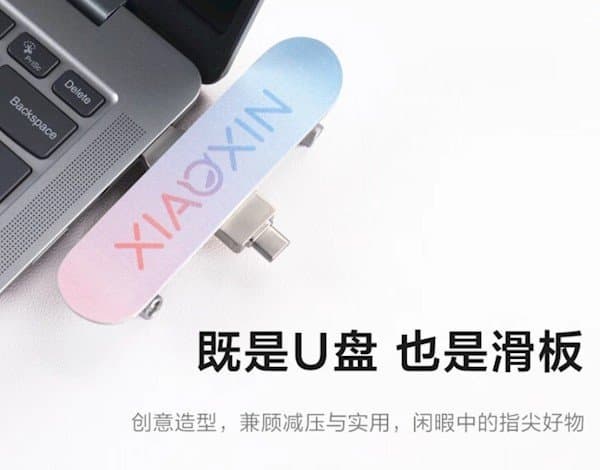 Как можно видеть, накопитель выполнен в форме маленького скейтборда или фингерборда. Причём тут есть даже колёсики, хотя по фотографиям неясно, можно ли использовать это устройство именно как фингерборд.