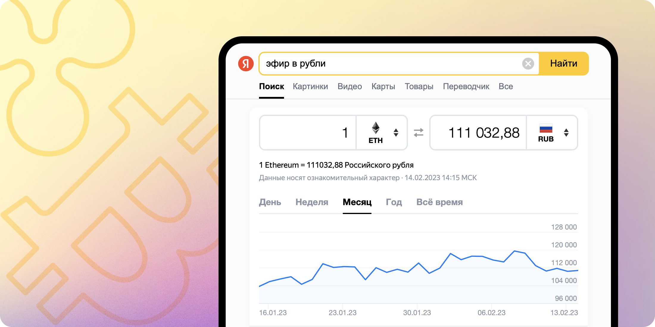 Над результатами поиска отображается виджет с графиком курса и инструментом для быстрой конвертации. Как отмечают разработчики, сервис понимает, что именно ищет человек, по текстовым запросам: например, «цена Dogecoin». При их обработке может учитываться даже сленг: «почём эфир» или «битки в турецкие лиры».