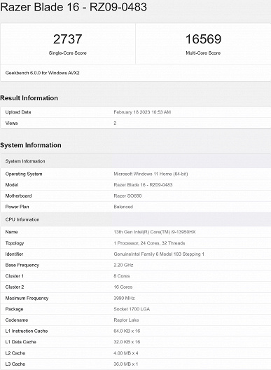 В Сети появился тест ноутбука Razer Blade 16 в новом бенчмарке Geekbench 6, и результаты получились довольно интересными: оказалось, что производительность мобильного CPU Intel примерно равняется производительности топового процессора AMD для настольных компьютеров.