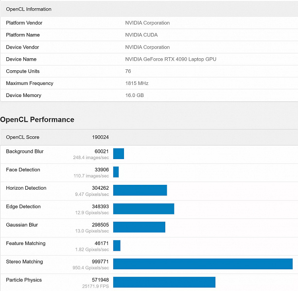В состав Razer Blade 16 входит GeForce RTX 4090 Laptop, и ее тоже протестировали. Результат в тесте OpenCL – 190 024 балла. Это уровень настольной GeForce RTX 3090 (199 120 баллов). Но если GeForce RTX 4090 Laptop немного разогнать (если такое позволит система охлаждения ноутбука), то она окажется даже быстрее GeForce RTX 3090 Ti.