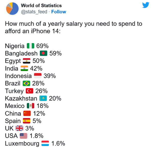 Согласно последним статистическим данным, опубликованным World of Statistics, среднестатистический американский потребитель может позволить себе iPhone 14, потратив всего 1,8% своего годового заработка. Жителям некоторых других стран придётся потратить более 50% дохода.