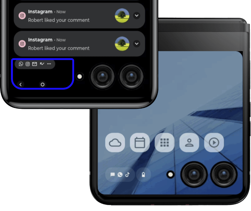 Судя по изображениям, экран Motorola Razr 2023 займёт практически всю переднюю панель, в нём даже есть вырезы под объективы камеры и вспышку. На одном из изображений видно, как Motorola адаптирует программное обеспечение к необычному дисплею.