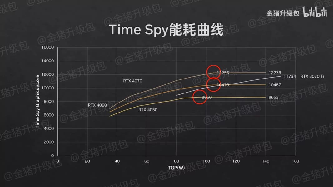 Тесты говорят о том, что GeForce RTX 4050 Laptop перестаёт демонстрировать рост производительности при превышении лимита мощности свыше 95 Вт. RTX 4060 Laptop и RTX 4070 Laptop останавливаются на значении 105 Вт.