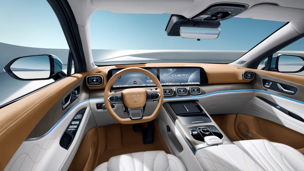 Кроссовер будет предлагаться в двух версиях компоновки салона – 5- и 7-местной, но на фото показан интерьер 5-местной. Он выглядит эффектно и с намеком на премиум: сидения, оформленные белой кожей, сочетаются с коричневым рулем и того же цвета вставками на дверных картах. Потолок – светлый, а низ, опять же, коричневый. Это не самые практичные сочетания цветов, но если такие цвета доступны для какого-нибудь Range Rover, то почему Chery не может позволить предложить подобное покупателям?