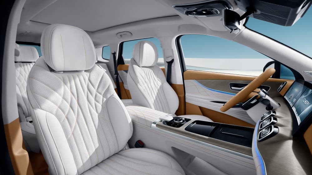 На передней панели два экрана (диагональ не сообщается). И хотя они не интегрированы в саму панель, но и не торчат, как в некоторых других моделях. Приметный элемент – прямоугольные дефлекторы системы вентиляции справа от водителя. Конечно, нельзя не отметить атмосферную подсветку.