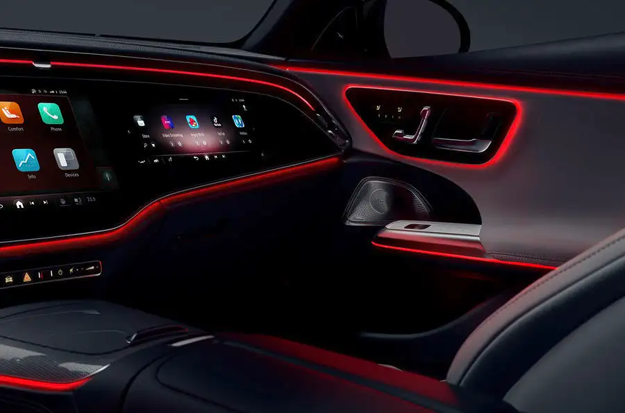 Среди опций — новый проекционный дисплей. Он получает более широкое поле и новые функции дополненной реальности. Mercedes также оснастил новый E-Class более совершенной системой окружающего освещения, которую можно запрограммировать на пульсацию в сочетании с музыко. Система также используется в качестве предупреждения для других функций, включая помощника по парковке, систему приближения к перекрестку и помощь при торможении.