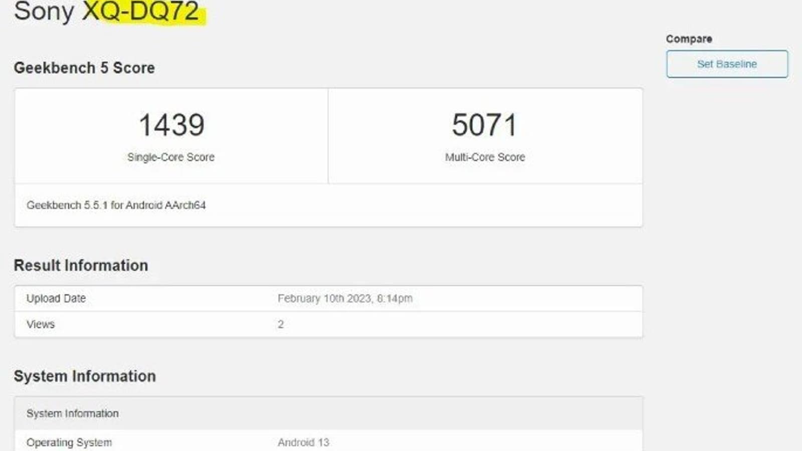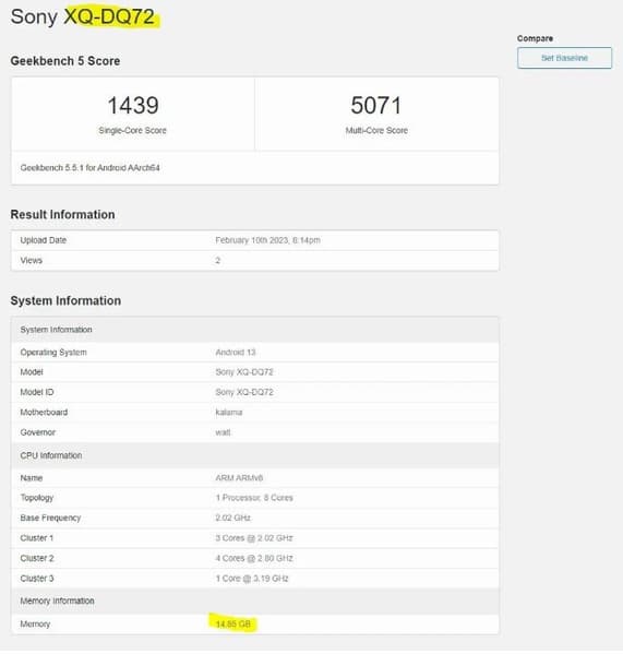 В базе бенчмарка Geekbench засветился перспективный смартфон Sony с каталожным номером XQ-DQ72. Судя по этому номеру, тестировался Sony Xperia 5 V (каталожный номер Xperia 5 IV – XQ-C).