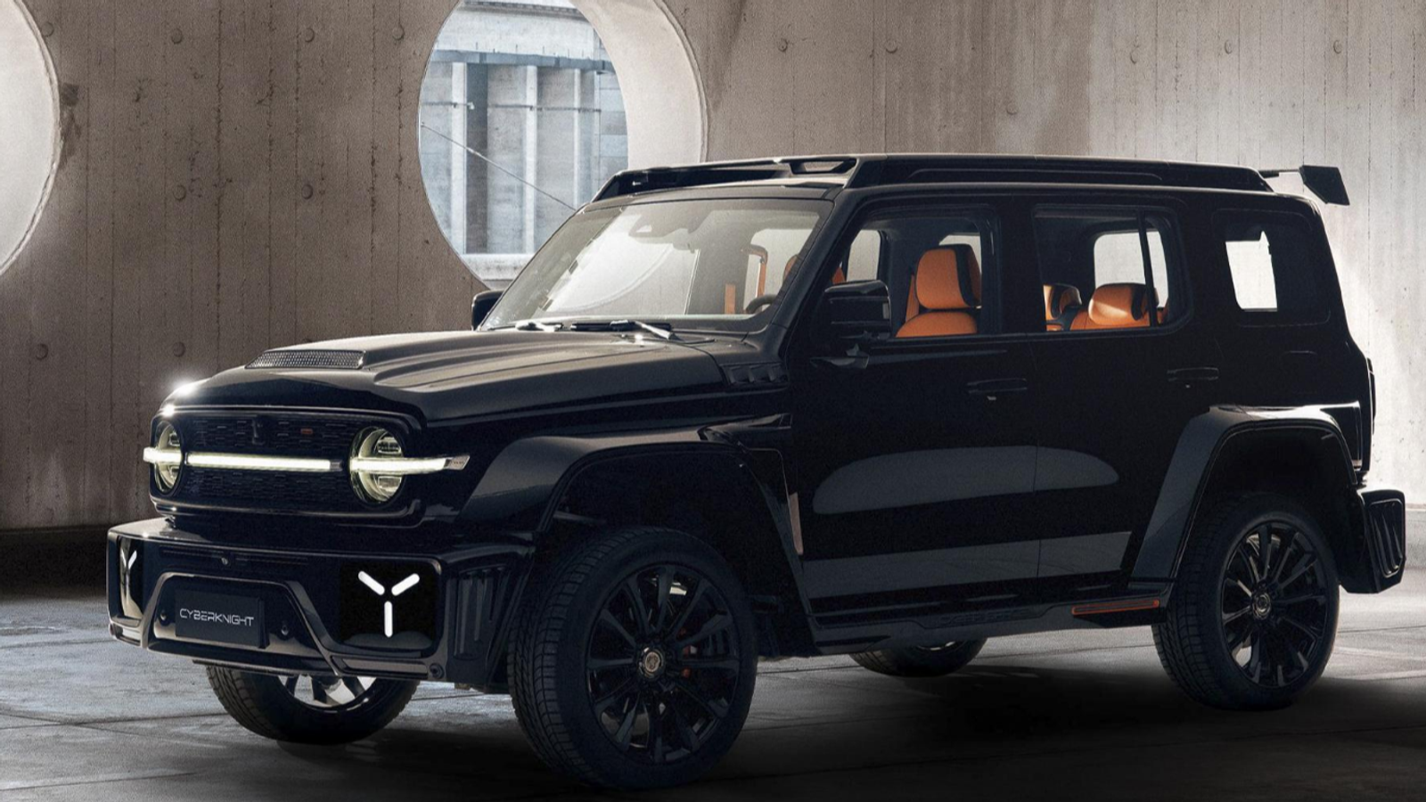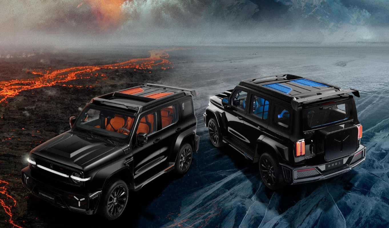 Tank 300 Cyber Knight получил спортивный обвес, дополнительное освещение и спойлер из углеродного волокна, а также крышку запасного колеса на задней двери и затемненные задние фонари в матричном стиле.